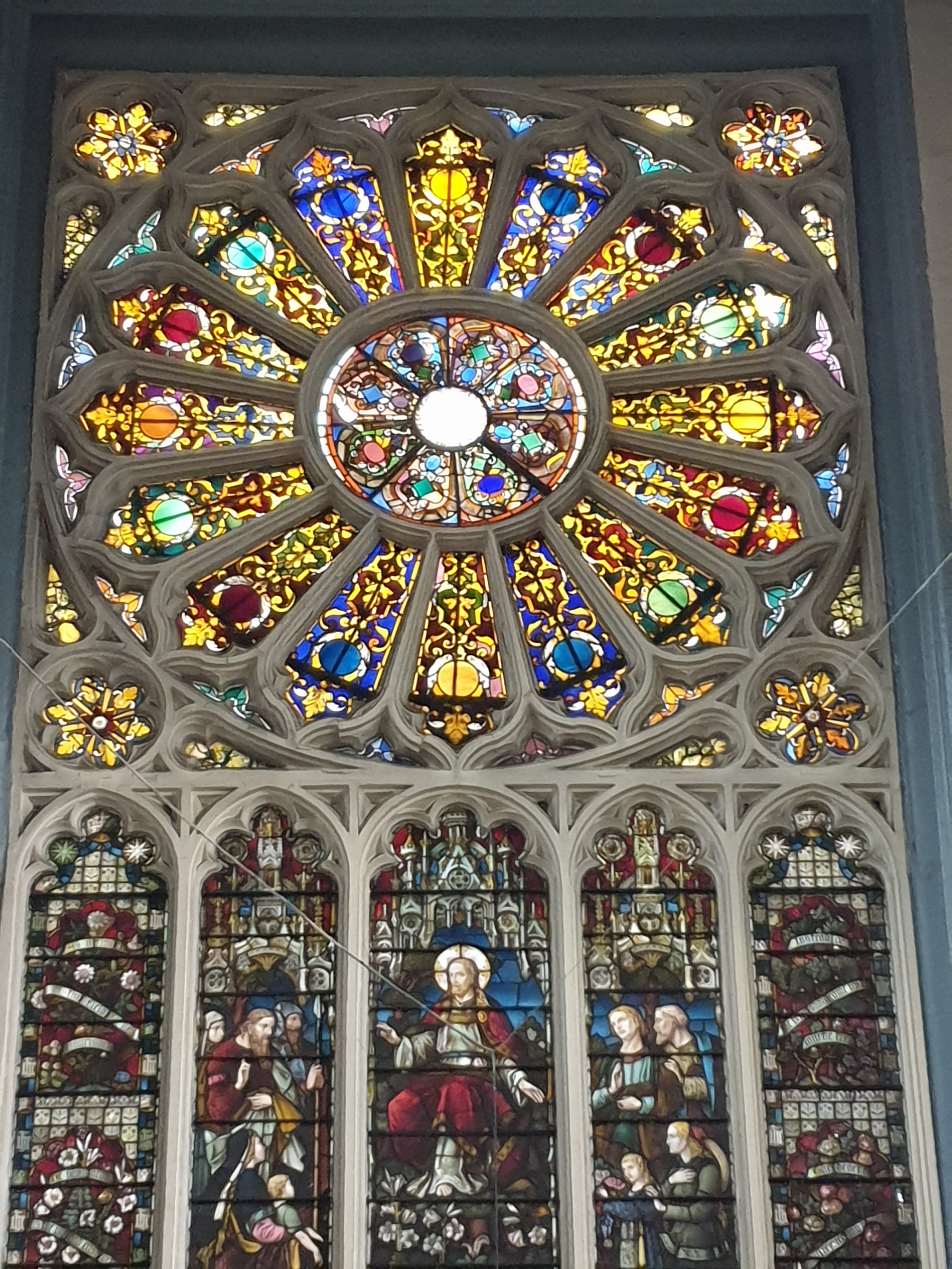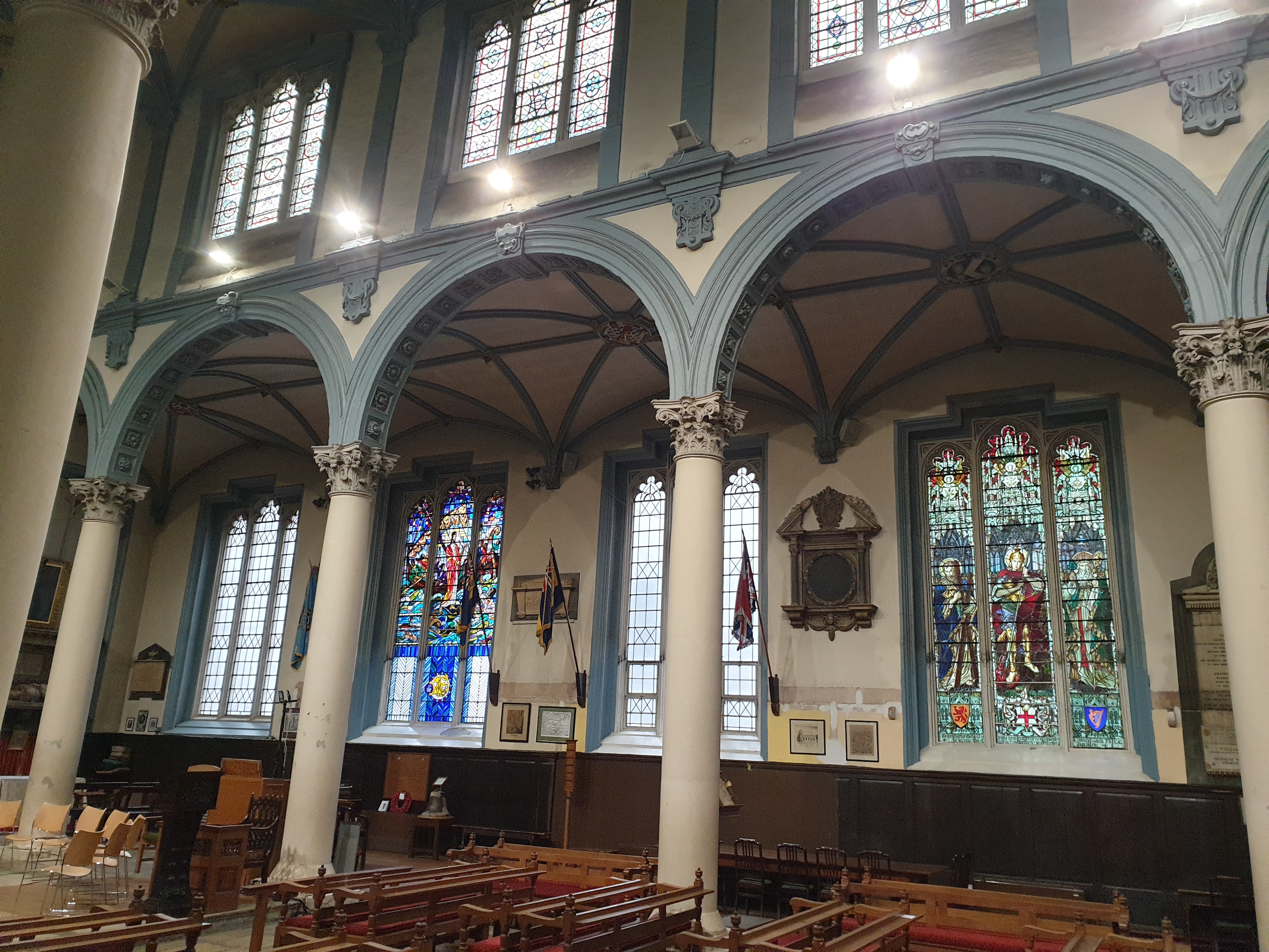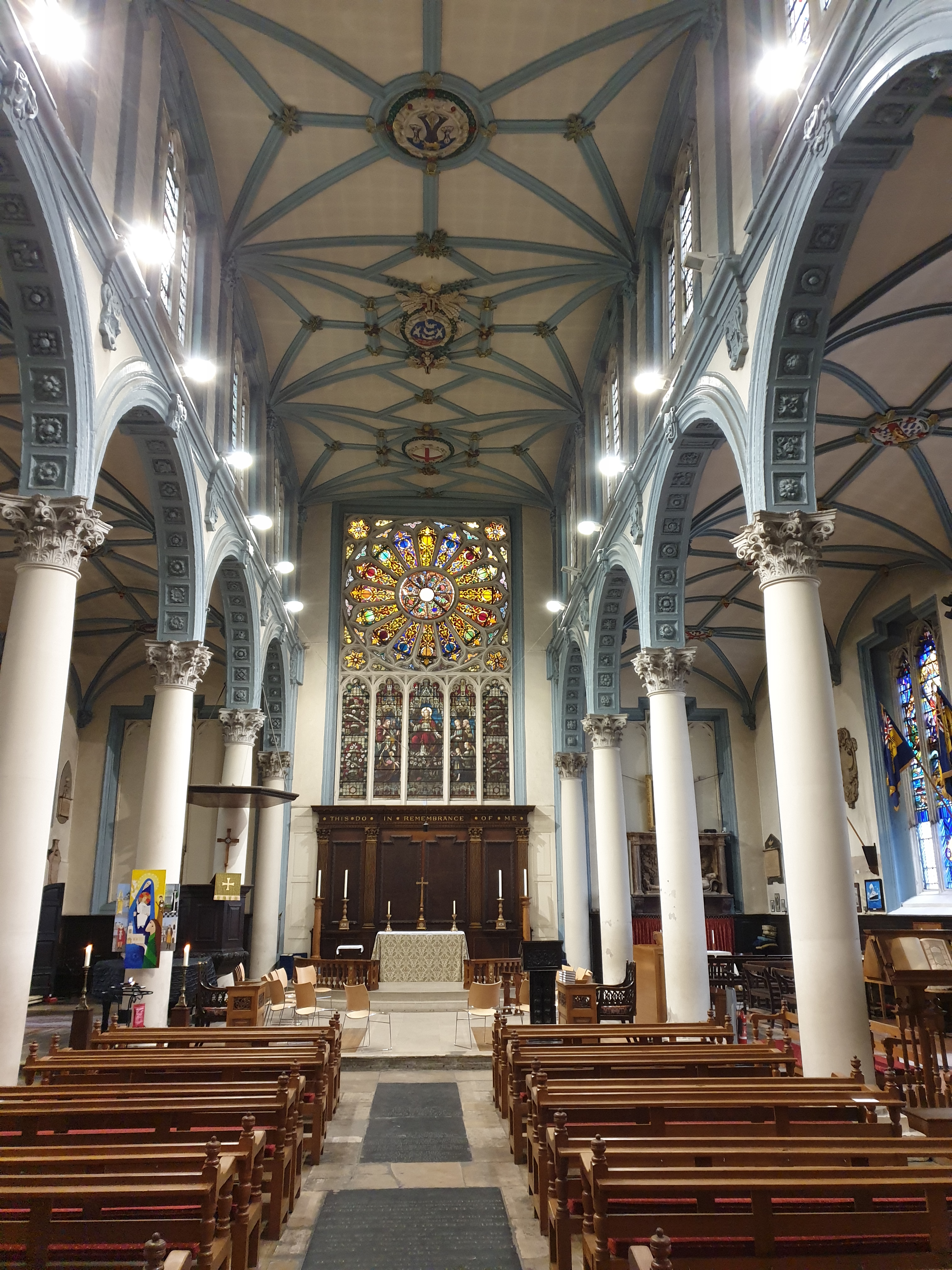 The church has a high nave dominated by a Gothic ribbed ceiling. It is surrounded on either side by narrow aisles with arcades supported on Corinthian columns. The east end contains a magnificent window in the shape of a Catherine Wheel. This is reputedly modelled on the much larger one in Old St Paul’s Cathedral (sadly destroyed in the Great Fire).
