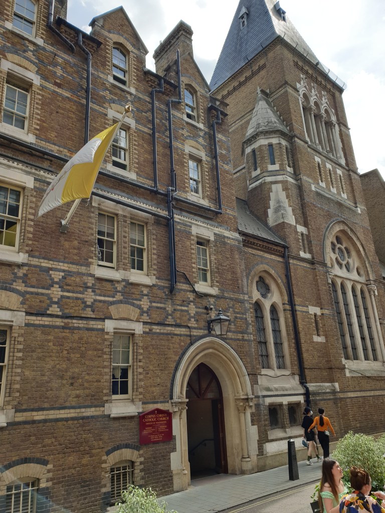 The foundation stone was laid in 1873 on the site which had been leased to the parish by the Duke of Bedford on condition that the building should cost no more than £6,000. In fact, the total cost was £8,000 and it was to be 1956 before this debt was paid off therefore allowing the church to be consecrated. The church however opened in 1874 by the Cardinal Archbishop of Westminster, Henry Manning. It is dedicated to Corpus Christi “as an act of reparation for the indignities offered to the Blessed Sacrament in this country in the sixteenth century and since”.